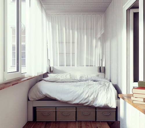 Использование двуспальной кровати, также возможно, но только, если балкон достаточно широкий. Приготовьтесь к тому что, так или иначе, такая кровать, скорее всего, займёт большую часть пространства.