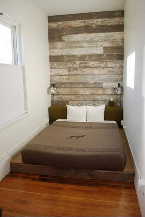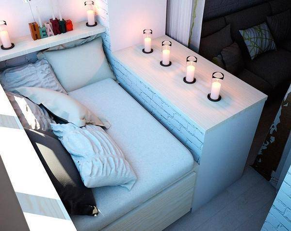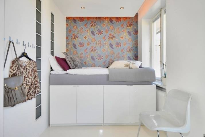 Вопрос недостатка свободной площади решается установкой кровати-подиума. Для этого делают небольшое возвышение над уровнем пола, а на него укладывают матрас. Вместо шкафов навешивают полочки, устанавливают оригинальные светильники.