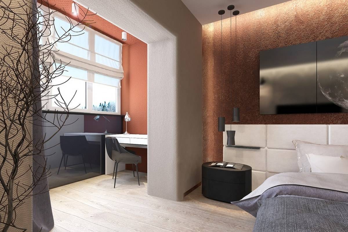 - Разделение на функциональные зоны. Чаще всего их две – балкон и спальня. Этот дизайн потребует демонтажа окна и разделяющей стены. Перегородкой здесь будет выступать арка. Оформив области комнаты в одной стилистике, можно добиться плавного перехода спальни в лоджию.