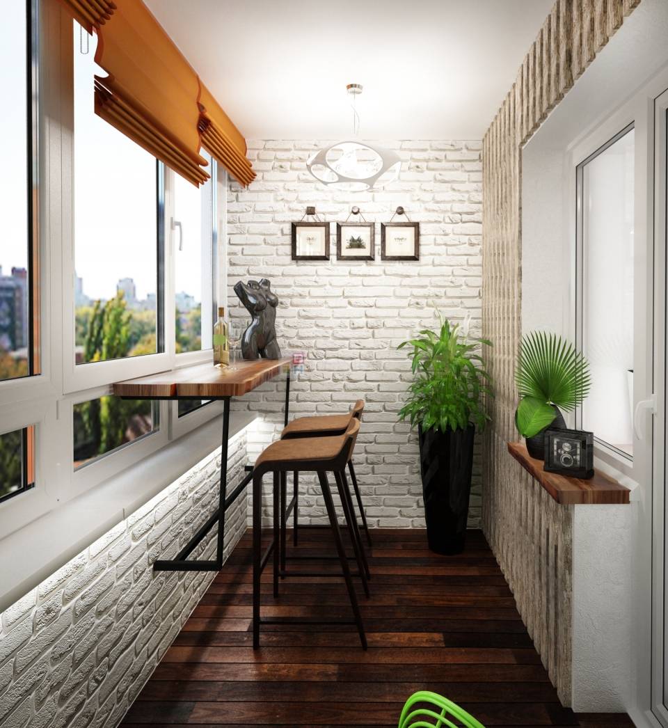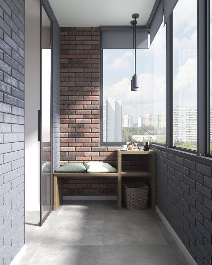 При таком подходе отделка балкона внутри должна перекликаться с оформление кухни. Неплохо смотрится отделка под кирпич в сочетании с гладкими стенами из гипсокартона.