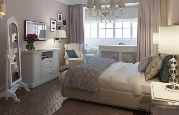 Не забывайте, что в дизайне спальни, даже с добавленной площадью балкона, главное – это создать нормальные условия для сна. Это значит, что приоритетом в обстановке должно пользоваться спокойствие. Ультрамодные насыщенные цвета быстро опостылеют, поэтому их лучше добавлять в декор исключительно в акцентах. Так их проще будет заменить при случае. Очень хорошо воспринимается обстановка перепланированной комнаты, если отделка соединенных зон выполнена в едином цветовом решении, но материалами разной фактуры. Таким же образом можно выполнить деление комнат на зоны при помощи разнофактурности напольного покрытия.