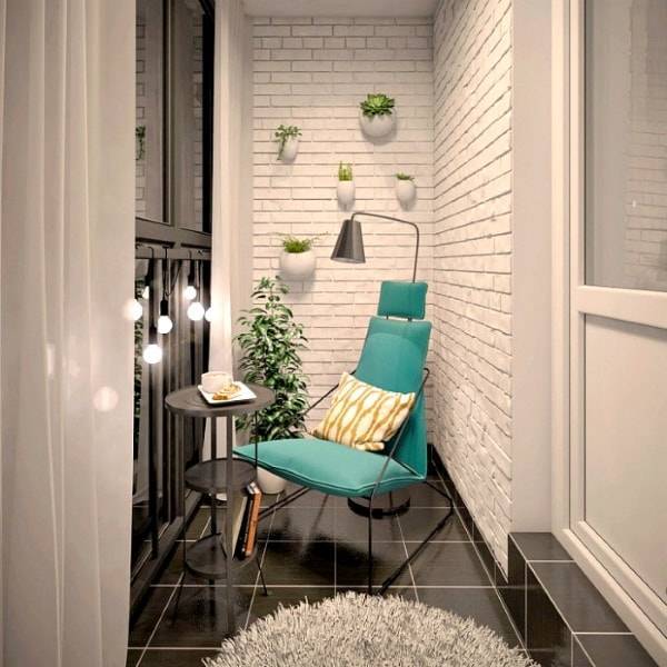 Если квартира маленькая, и вещи девать просто некуда, на балконе или лоджии устанавливают шкафы или полочки. Их разместить можно так, чтобы еще осталось место для кресла, или хотя бы для складного стула.