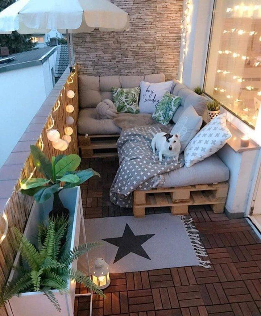 Такой выбор отлично подойдет, если стиль балкона относится к природе. Мебель из поддонов, льняные подушки, тканые одеяла, атмосферное освещение и деревянный пол — все это создает поистине неповторимую атмосферу даже в самом центре шумного города.