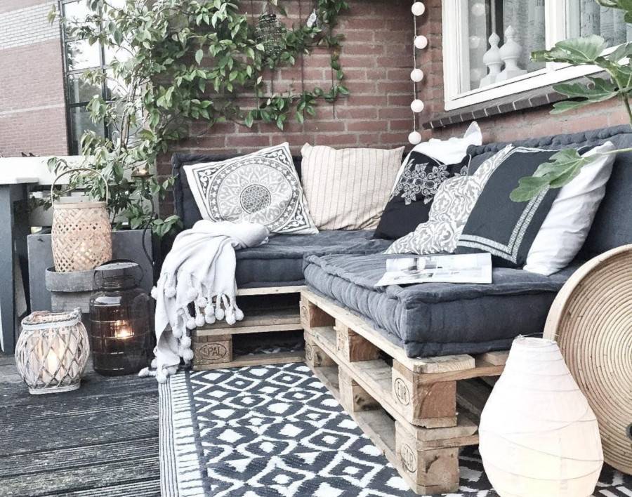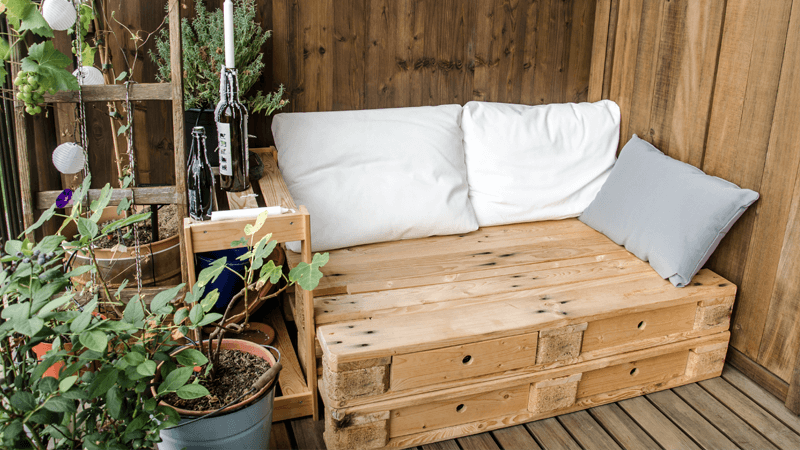 Отличный вариант — использовать поддоны, которые дешевы и дают возможность создать много интересных предметов, например, диванов или скамеек. Достаточно разбить поддоны и использовать обычные подушки.