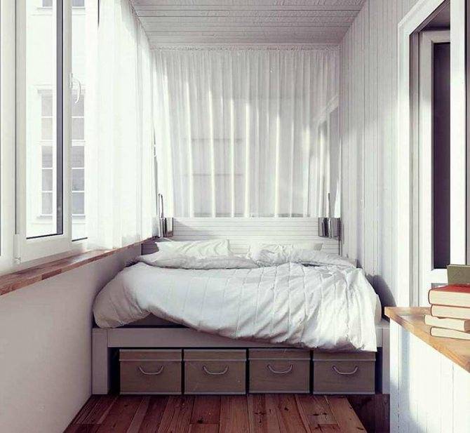 Перед устройством на балконе комнаты с кроватью нужно решить, будет ли это функциональное назначение неизменным в течение года. Или дополнительное место для сна понадобится лишь в теплый сезон? От ответа на этот вопрос зависит степень благоустройства помещения, а также выбор кровати.