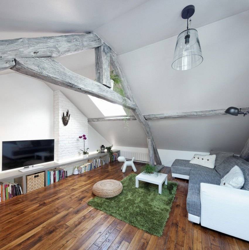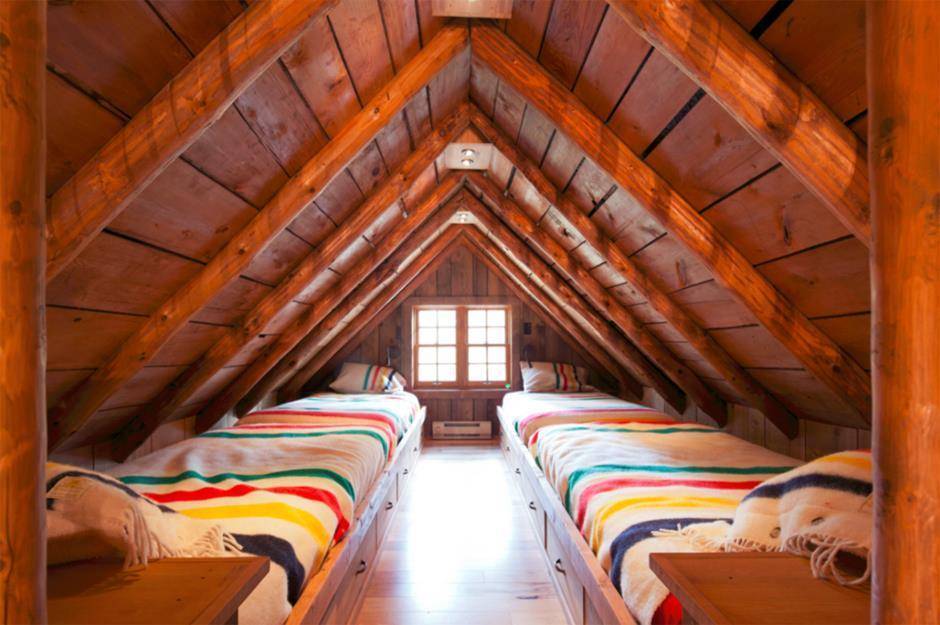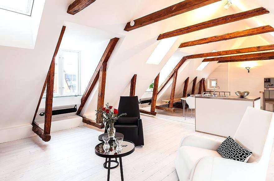 Крыша с балками или со стойками может стать изюминкой интерьера, если правильно подобрать стилевое направление. Расположение мебели может вызвать некоторые трудности, но при желании их можно решить.