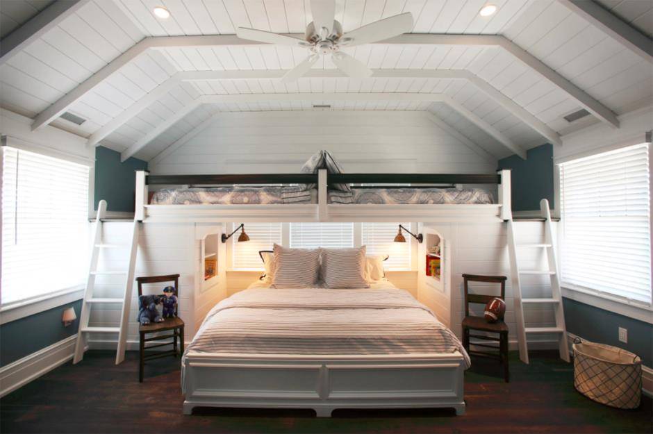 Помещение — идеальное место для создания дизайна спальни в мансарде в морском стиле. При условии достаточного количества пространства, здесь вы легко создадите уголок для размещения четырех человек. Светлая отделка потолка и стен, в сочетании с морской тематикой в декоре помогут создать необычайную комнату для сна. Наличие синих, бирюзовых и голубых оттенков может быть компенсировано белым цветом для потолка и стен.
