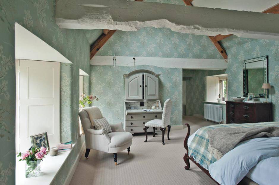 Деревенские стили. К ним относится русский стиль, кантри и прованс. Популярность этих стилей объясняется той атмосферой уюта, которую они способны создать. Если вы остановитесь на одном из этих направлений, то маскировать потолочные балки уже не придется — они гармонично впишутся в дизайн спальни. В оформлении используется удобная и практичная мебель, большое количество текстиля, разнообразный милый сердцу декор. Цветовая палитра основана на использовании природных оттенков — коричневых, зеленых, бежевых; охотно используются геометрические и растительные орнаменты. Спальня на мансарде в стиле прованс считается самым востребованным вариантом. Пол в таком помещении исключительно деревянный, стены оклеиваются изящными узорчатыми обоями или небрежно штукатурятся, в палитру добавляются яркие акценты лаванды и бирюзы.