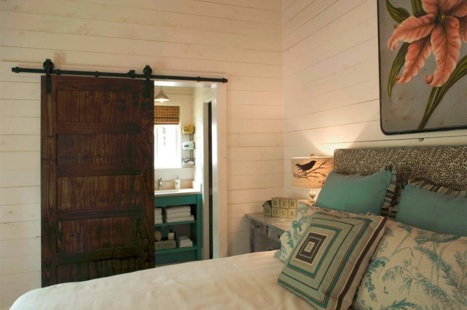 Сочетание деревянной отделки и белого цвета станет эффектным решением для главной спальни. Но кто сказал, что специфическое помещение не может быть одновременно и стильным, и функциональным. Создать настоящие апартаменты для проживания семейной пары можно, оборудовав дополнительно компактную ванную.