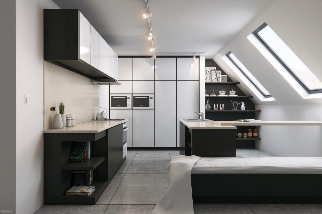 Подобный ультрамодерновый интерьер мансарды и спальня могут быть совмещены воедино только в просторном чердачном помещении с высокими потолками и большими окнами.