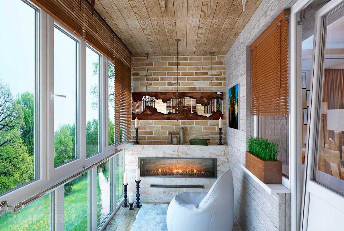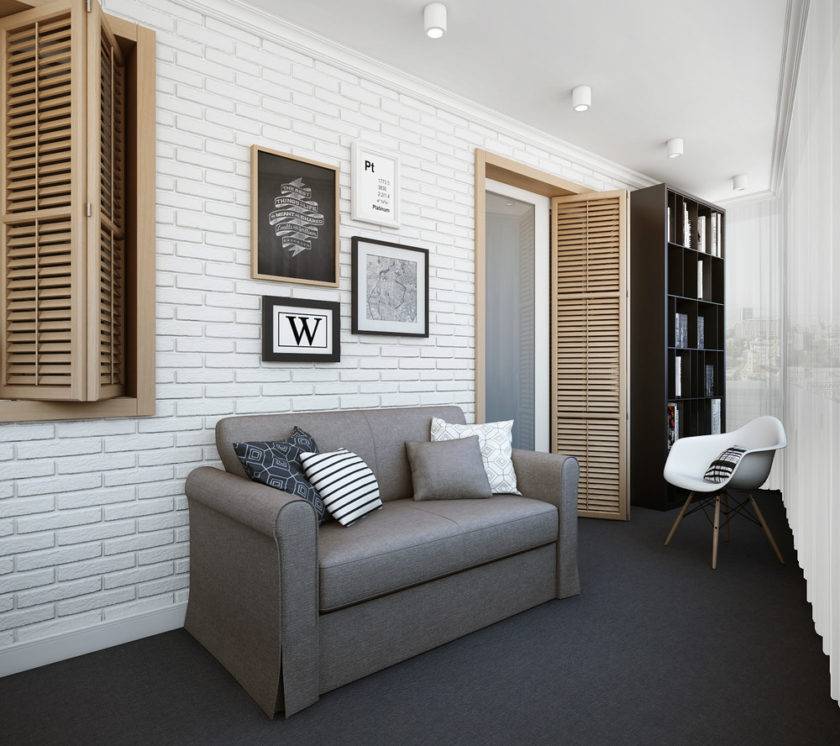 При таком подходе отделка балкона внутри должна перекликаться с оформление кухни. Неплохо смотрится отделка под кирпич в сочетании с гладкими стенами из гипсокартона.