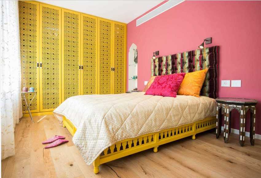 Желтый и золотистый оттенки наполнят спальню жизнелюбием и радостью теплого денька.