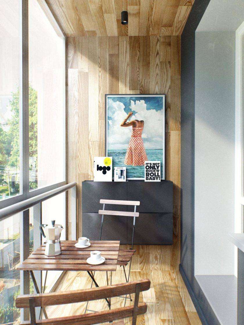 Для экономии площади заказывается мебель-трансформер: откидной столик, раскладные стулья из дерева, МДФ или ДСП. Стол в интерьере балконов 2020 года отлично заменяет широкий подоконник в комплекте с парой барных стульев.