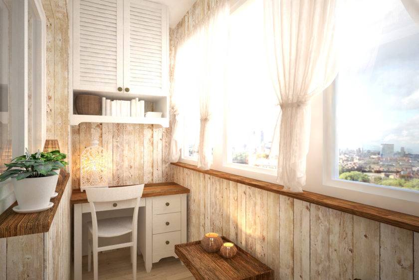 Чтобы создать максимально рабочую атмосферу, отделка лоджии внутри должна иметь звукоизолирующие свойства. Это дерево, пробка или виниловые обои на флизелиновой основе.