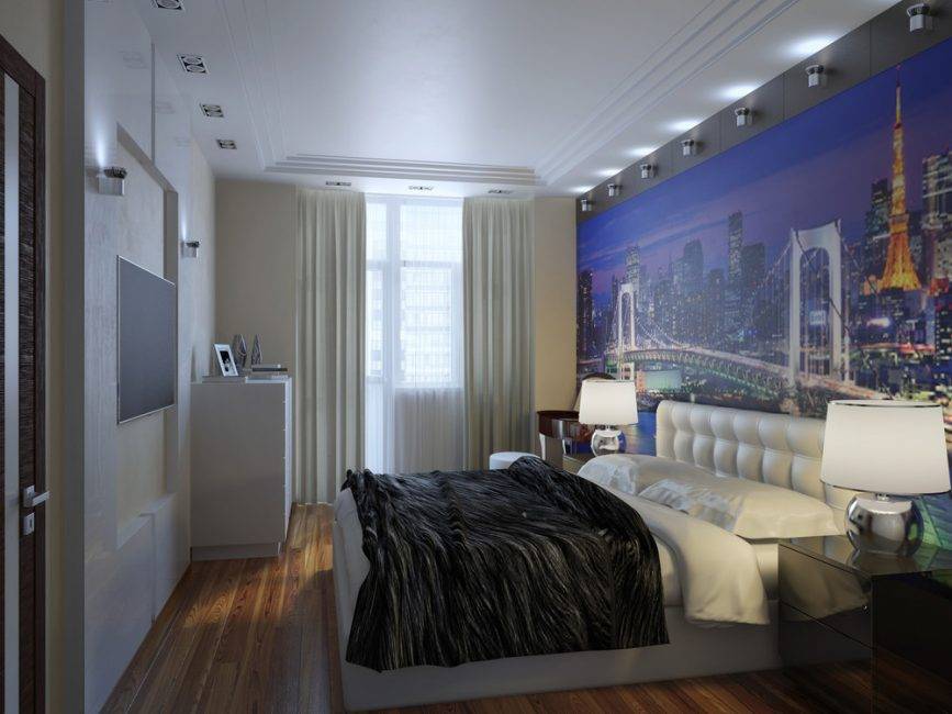 - помещения спален с ограниченными размерами необходимо расширить: для этого выбирайте сочетаемые светлые оттенки или наклейте контрастные реалистичные фотообои с изображением панорамных сюжетов эффектом на одной из стен;