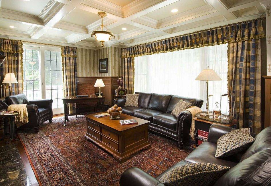 В гостиной в английском стиле должен быть диван, персидский ковер или индийский столик. В любом интерьере они приносят спокойствие и уютную атмосферу. Вы можете повесить длинные шторы на окнах. Деревянный пол работает отлично. Мягкая мебель может быть обшита. Дизайн приветствует сочетание с охотничьими мотивами.