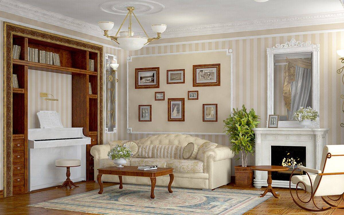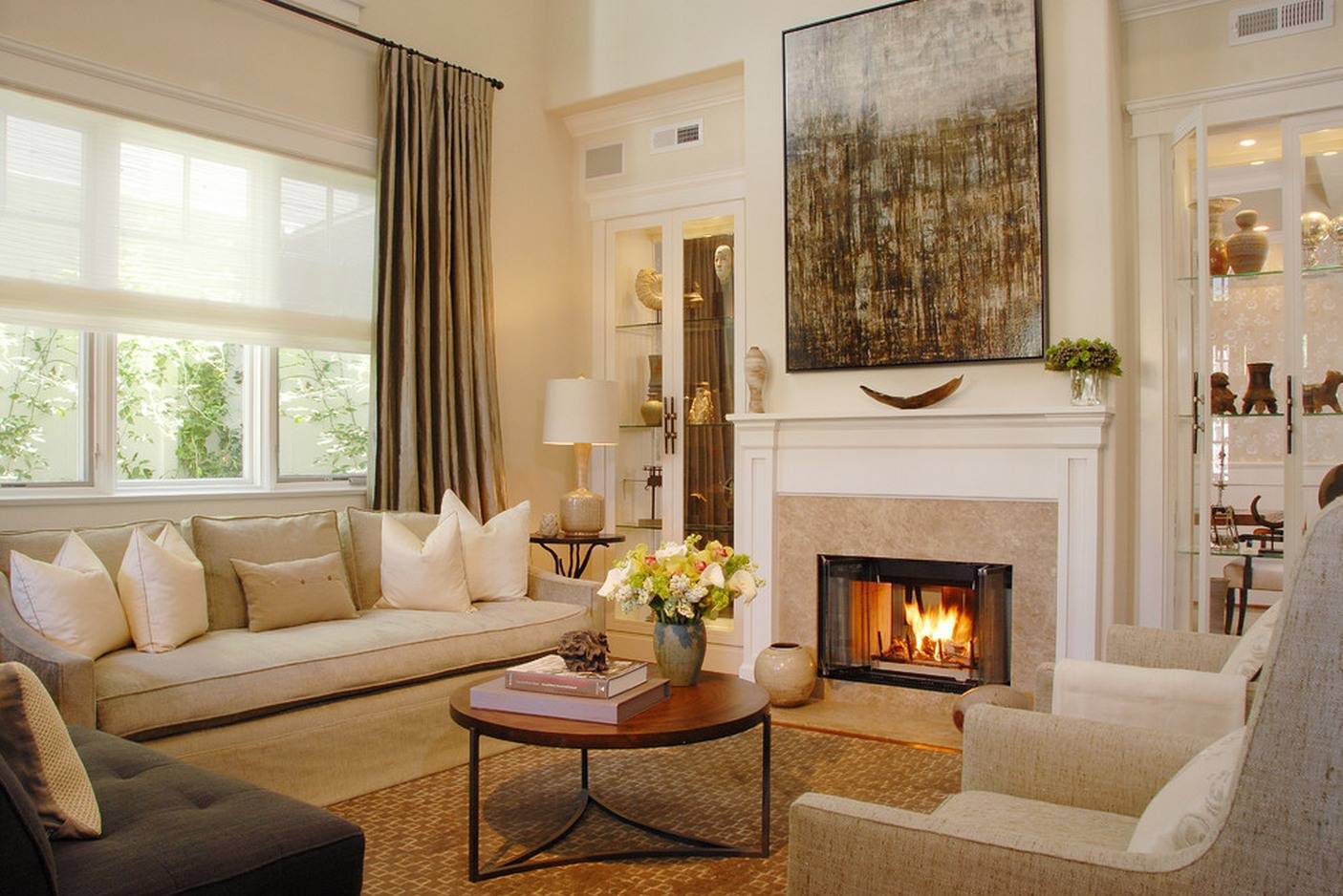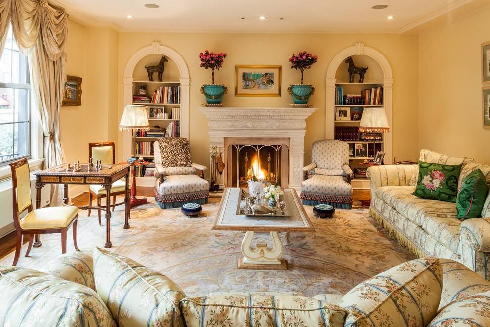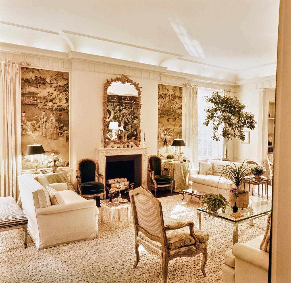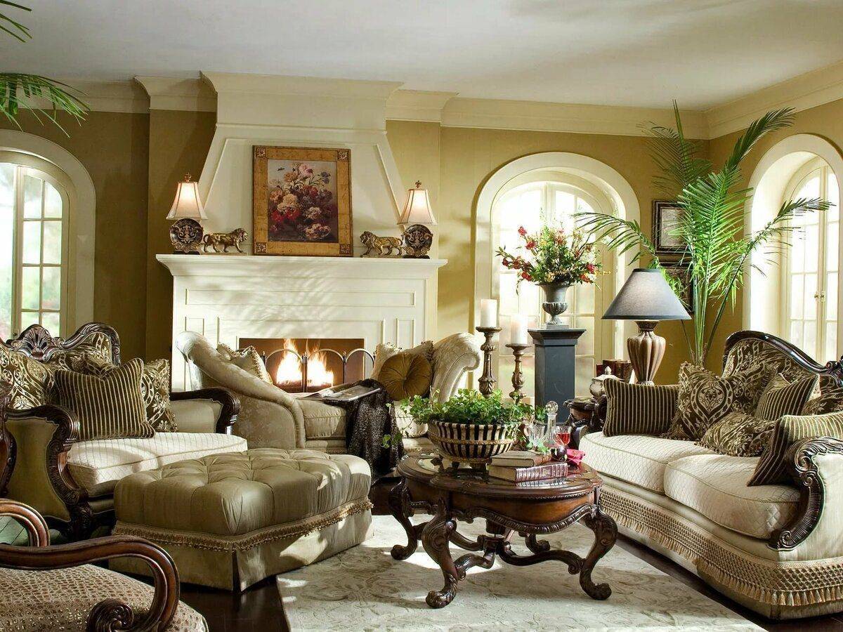 Для обстановки комнаты отдавайте предпочтение светлой мебели из дерева дорогих пород. Не забудьте про овальный столик для званых ужинов. Прекрасно впишется в интерьер искусственно состаренная мебель. Можно расположить по центру одной из стен камин, который добавит вашей гостиной уюта.