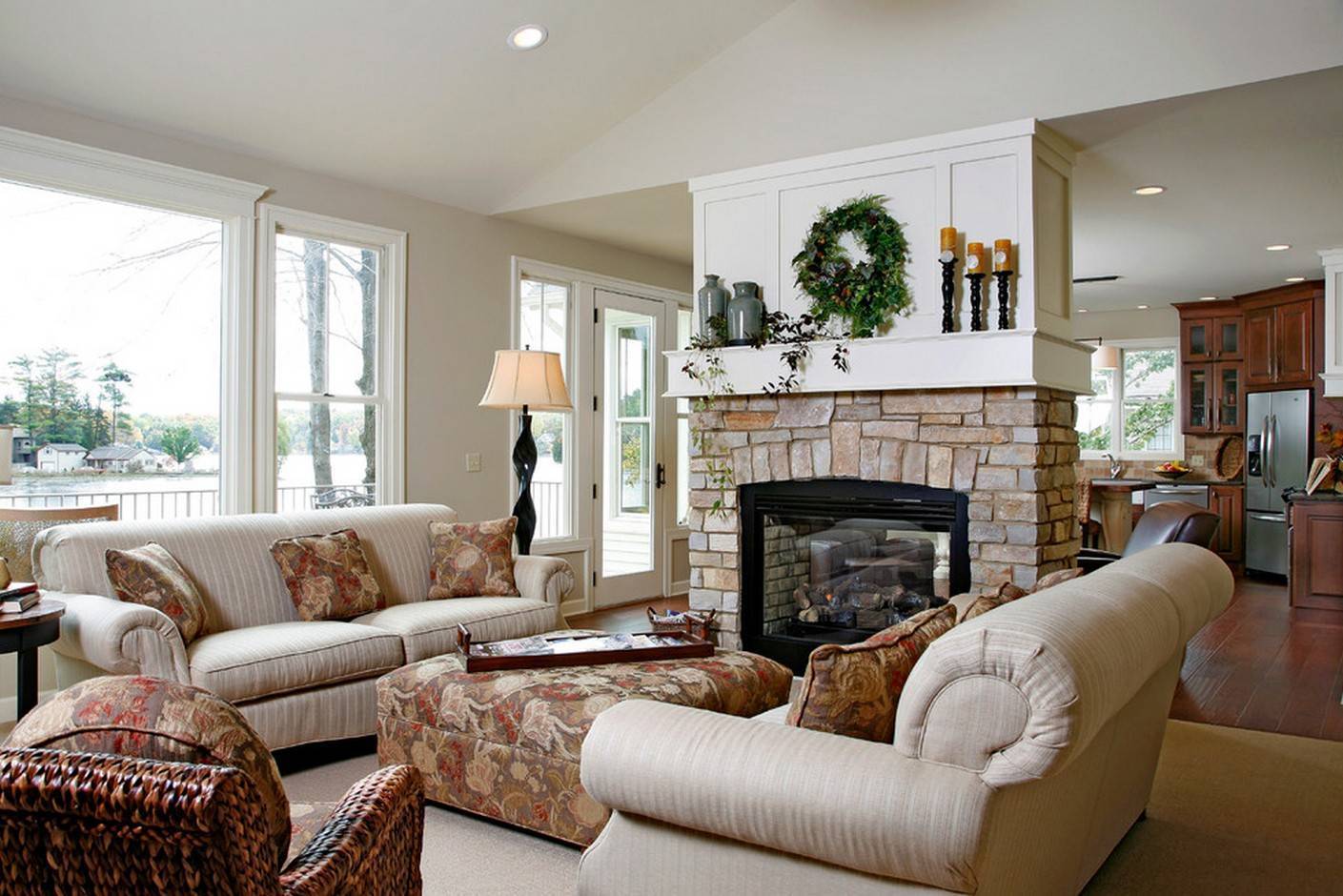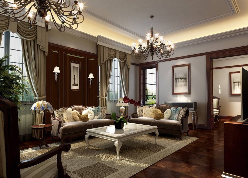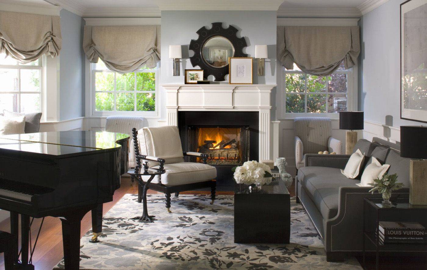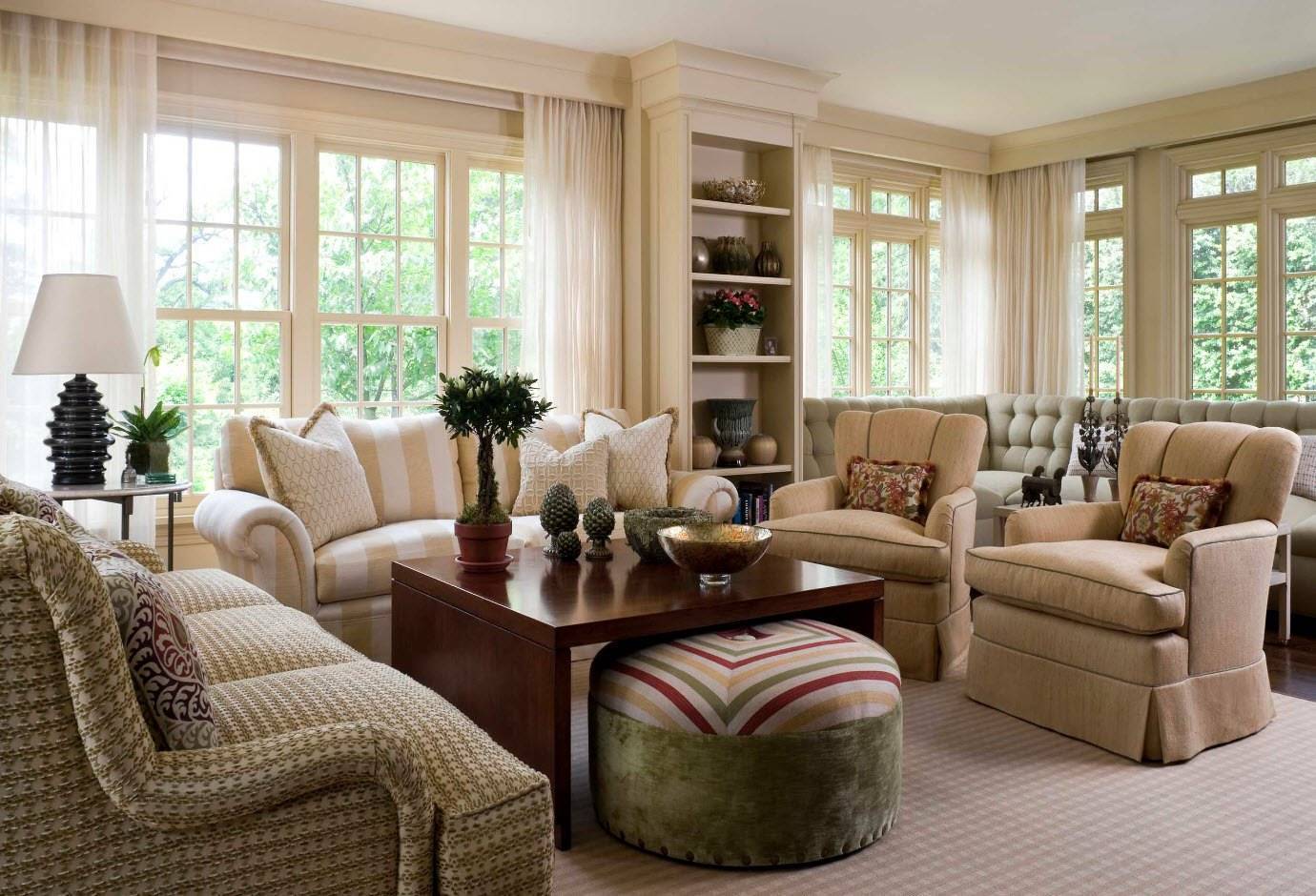 Для обстановки комнаты отдавайте предпочтение светлой мебели из дерева дорогих пород. Не забудьте про овальный столик для званых ужинов. Прекрасно впишется в интерьер искусственно состаренная мебель. Можно расположить по центру одной из стен камин, который добавит вашей гостиной уюта.