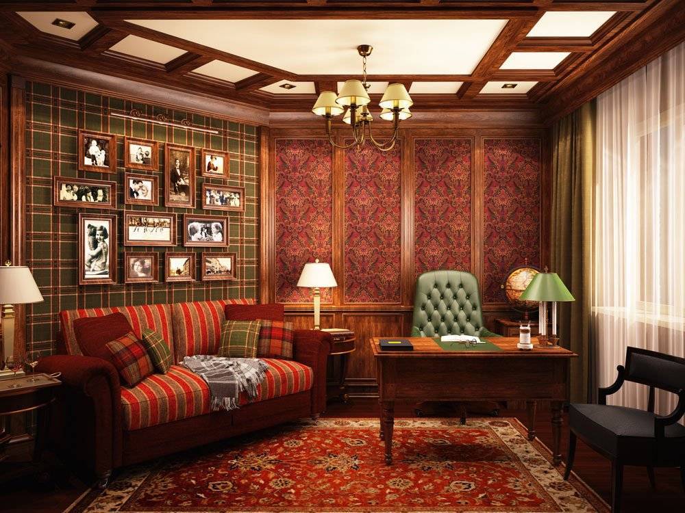 Британское направление часто встречается в кабинетах. Здесь вполне привлекательно смотрятся обои приглушенных тонов в клетку и полоску. В сочетании с мебелью из редких пород дерева и антиквариатом, настенное покрытие с этими рисунками делает пространство респектабельным.