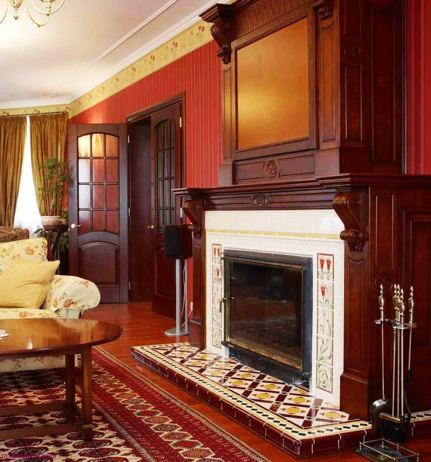 Цвет. Отдавайте предпочтение натуральным оттенкам: алому, коричневому, терракотовому. Допускается применение светлых оттенков золотого, серебряного цвета, тон слоновой кости. Для отделки используют только дерево дорогих пород: красное дерево, орех.