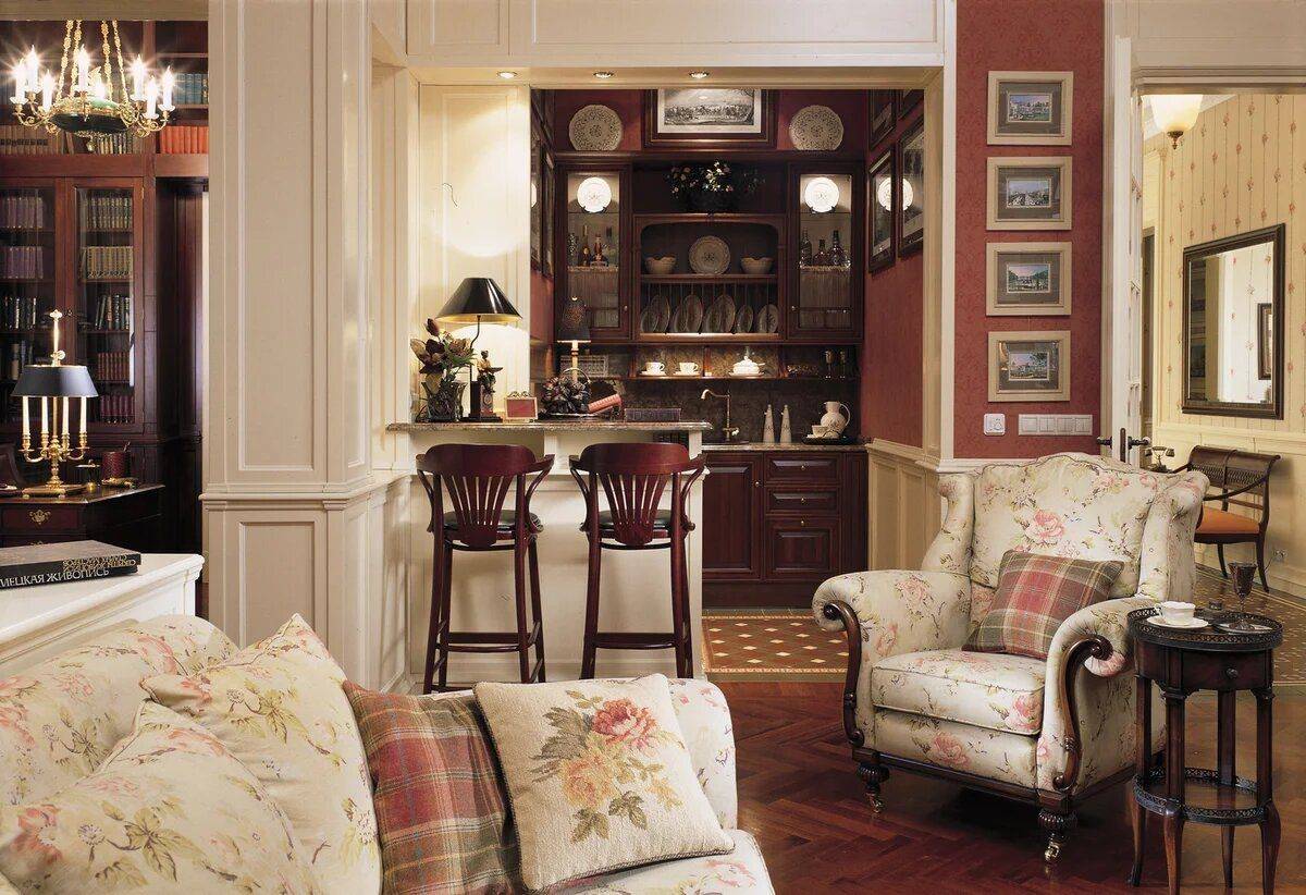Кухня-гостиная в английском стиле уютная и красочная. Удобные диваны, мягкие покрывала на них, персидские ковры и вездесущие цветы — настоящие вазы и украшения на обивке мебели. Английский стиль связан с комфортом. Мягкая мебель, подножки и пуфы очень распространены в таких интерьерах. Особенно интересно смотрится сочетание кухни и гостиной в одной тематике. Если в центре дома нет камина, то в интерьерах обязательно стоит поставить свечи. Ведущие цвета — пастель: бежевый, синий, светло-красный, зеленый и розовый. Они хорошо контрастируют с тяжелой мебелью или узорчатыми элементами дизайна интерьера. Стоит выбрать деревянный пол в гостиной, а керамическая плитка должна быть выбрана для кухни. Наиболее популярными являются так называемая шахматная доска на полу.