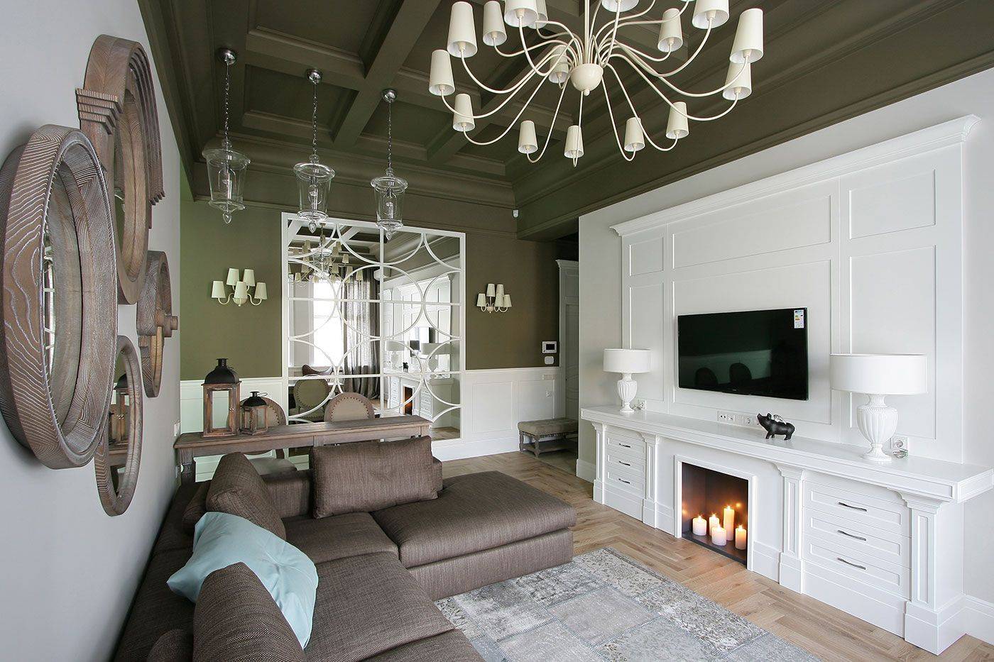 При оформлении просторного помещения нельзя забывать про хорошее освещение: при оформлении потолка можно использовать различные варианты осветительных приборов (от массивных люстр до миниатюрных встроенных светильников).