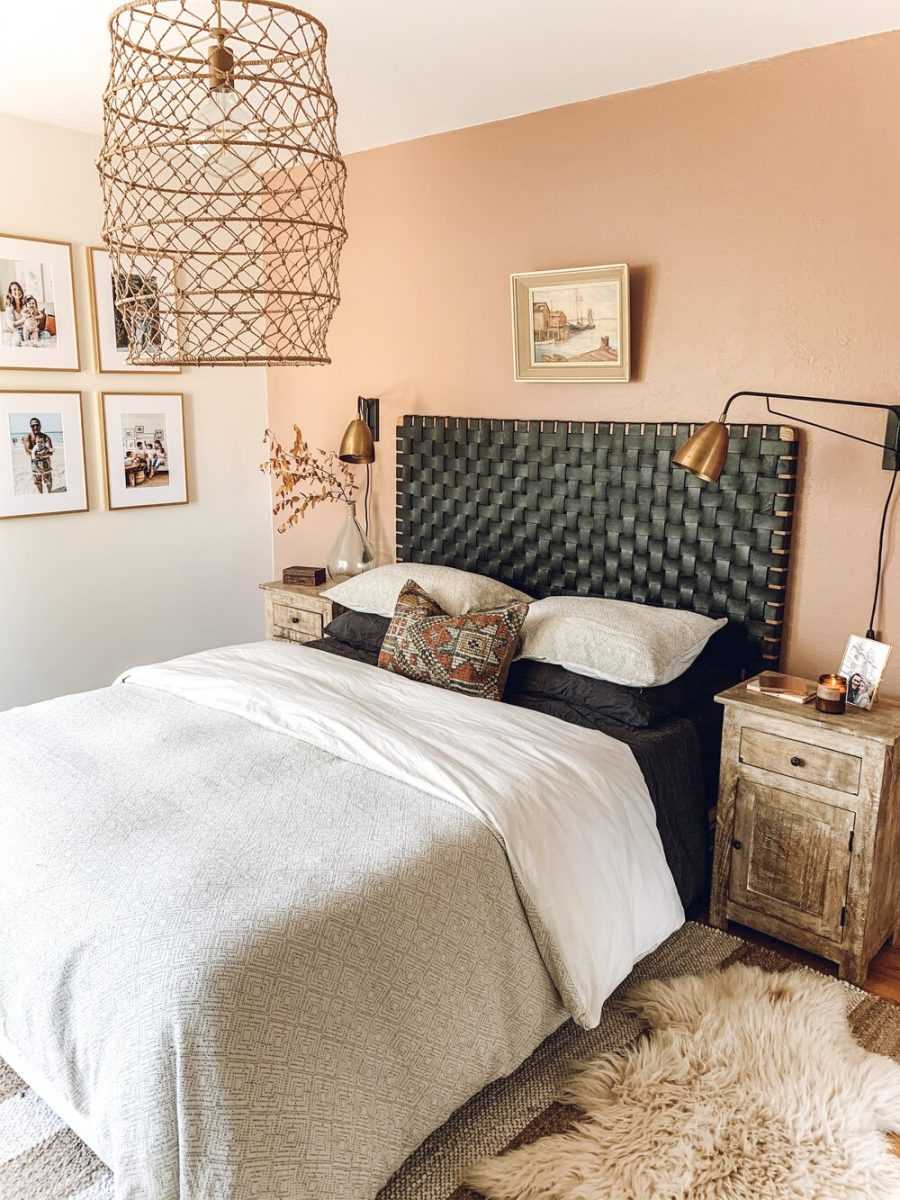 Акцентный элемент декора комнаты – стенка за кроватью. Её можно украсить гипсовыми или деревянными молдингами, парными светильниками или картинами. Композиция должна сохранять симметрию: в центре находится кровать, по бокам – тумбочки и светильники.