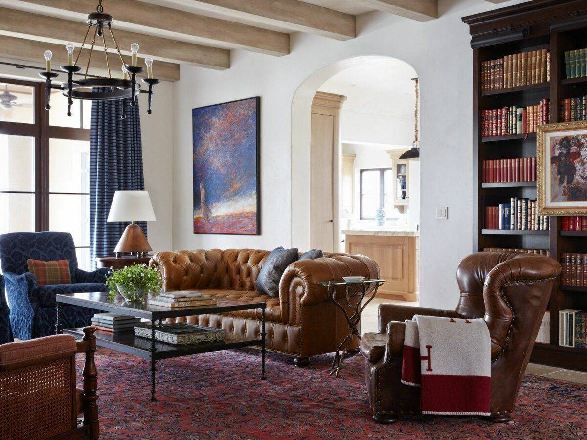 Идеально вписываются в интерьер в английском стиле шкафы, выполненные из темных пород дерева доверху забитые книгами. Очень популярен для данного интерьера низкий диван небольшого размера, обитый стеганым материалом и с овальными подлокотниками.