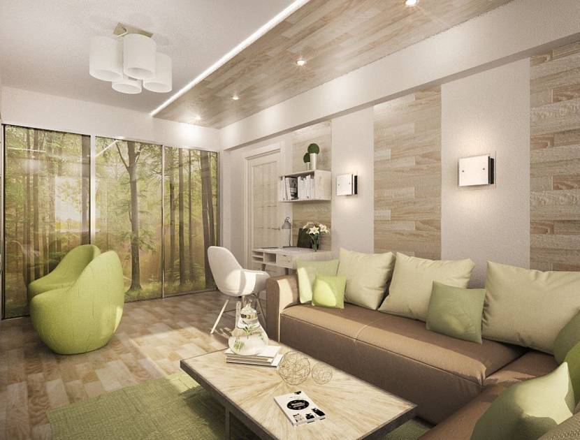 Основой оформления выступают древесные оттенки – от нежного пшеничного и льняного до золотисто-орехового и молочного кофейного. Гостиная в светлых тонах гармонично смотрится со свежим зеленым и лаконичным серым. В помещении нет места для неприродной ядовитой палитры.