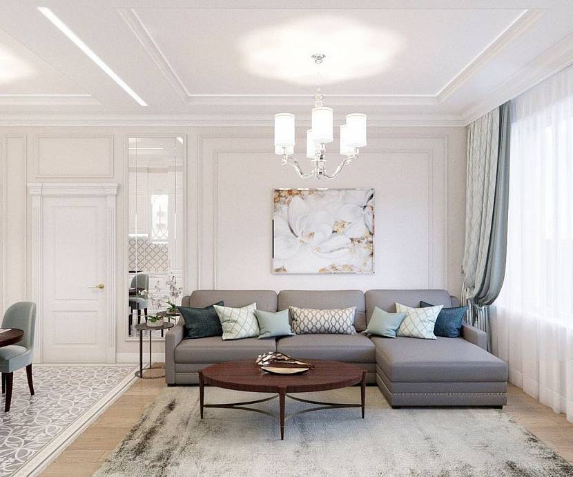 Чтобы зал выглядел гармонично, нужно подобрать правильную композицию. В дизайне активно используют цвета из разных палитр, расставляя акценты или играя на холодном или теплом звучании. Для интерьера в светлых тонах существует несколько актуальных стилей.