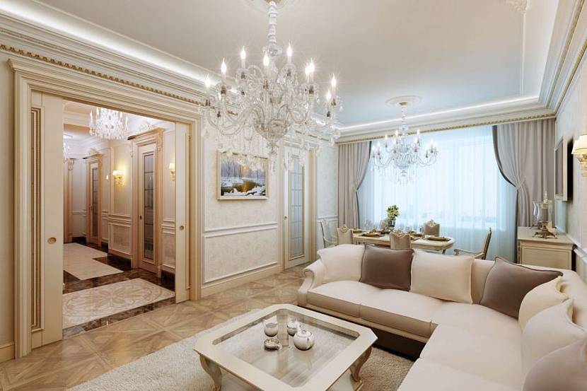 При оформлении зала в светлых оттенках для стен используют виниловые или флизелиновые обои. Универсальный отделочный материал может быть как однотонным, так и с неброским рисунком (фактурой). Дизайнеры часто выбирают рельефное сырье под покраску. В классических комнатах роскошно смотрятся интерьерные ткани и декоративная штукатурка.