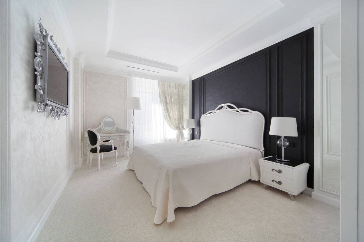 Не обязательно делать белый цвет доминирующим при создании общего фона. Белой, молочных оттенков краской можно покрыть потолок и двери, а на одну или все стены поклеить дорогие обои со сдержанным рисунком. Текстиль на окна, для обивки стульев, кресел, диванчиков следует использовать тех же оттенков. При этом особенно выигрышно будет смотреться белая кровать в интерьере спальни.