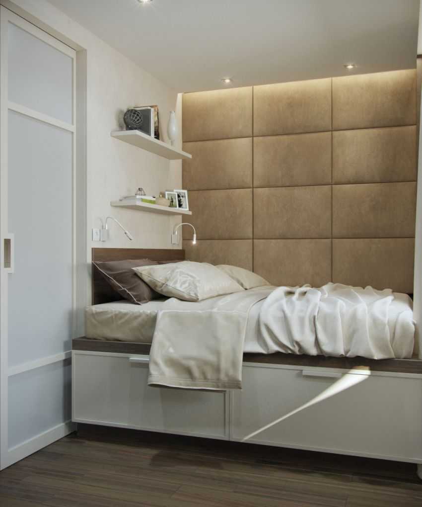 Часто спальня имеет и еще меньшую площадь, доходящую до 6 квадратных метров. Если в ней будет жить один человек, поместится полуторная кровать, шкаф, а также тумбочка или стол для работы. Если же планируется размещение двуспальной кровати, то в дополнение к ней поместится только один предмет мебели: стол, комод или шкаф. В таких маленьких спальнях кровать, как правило, располагается возле окна и роль прикроватной тумбочки выполняет полка над изголовьем или подоконник.