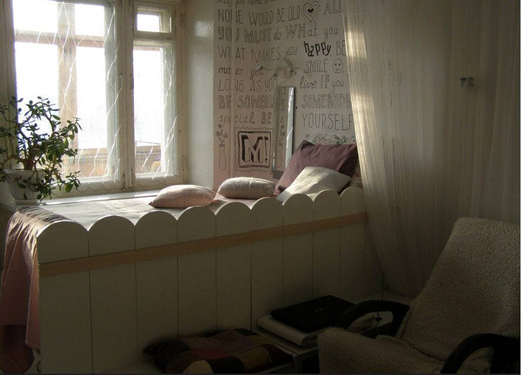 Еще один вариант размещения спальни — это лоджия. Если ее ширина около 1 метра, этого уже достаточно для организации спального места для одного человека. Если на окне в комнату установить широкий подоконник, получится довольно много места для личных вещей.