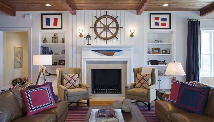 - всегда имеет в центре одной стены дровяной камин. Прямо над ним можно расположить настоящий штурвал корабля;
