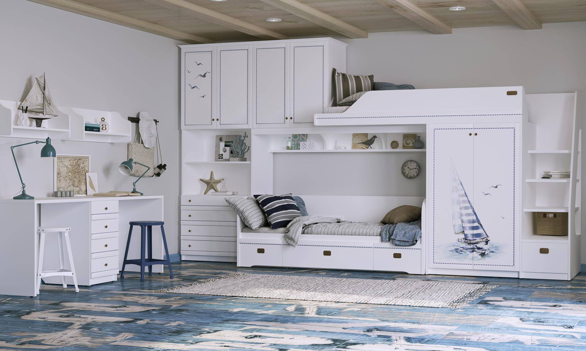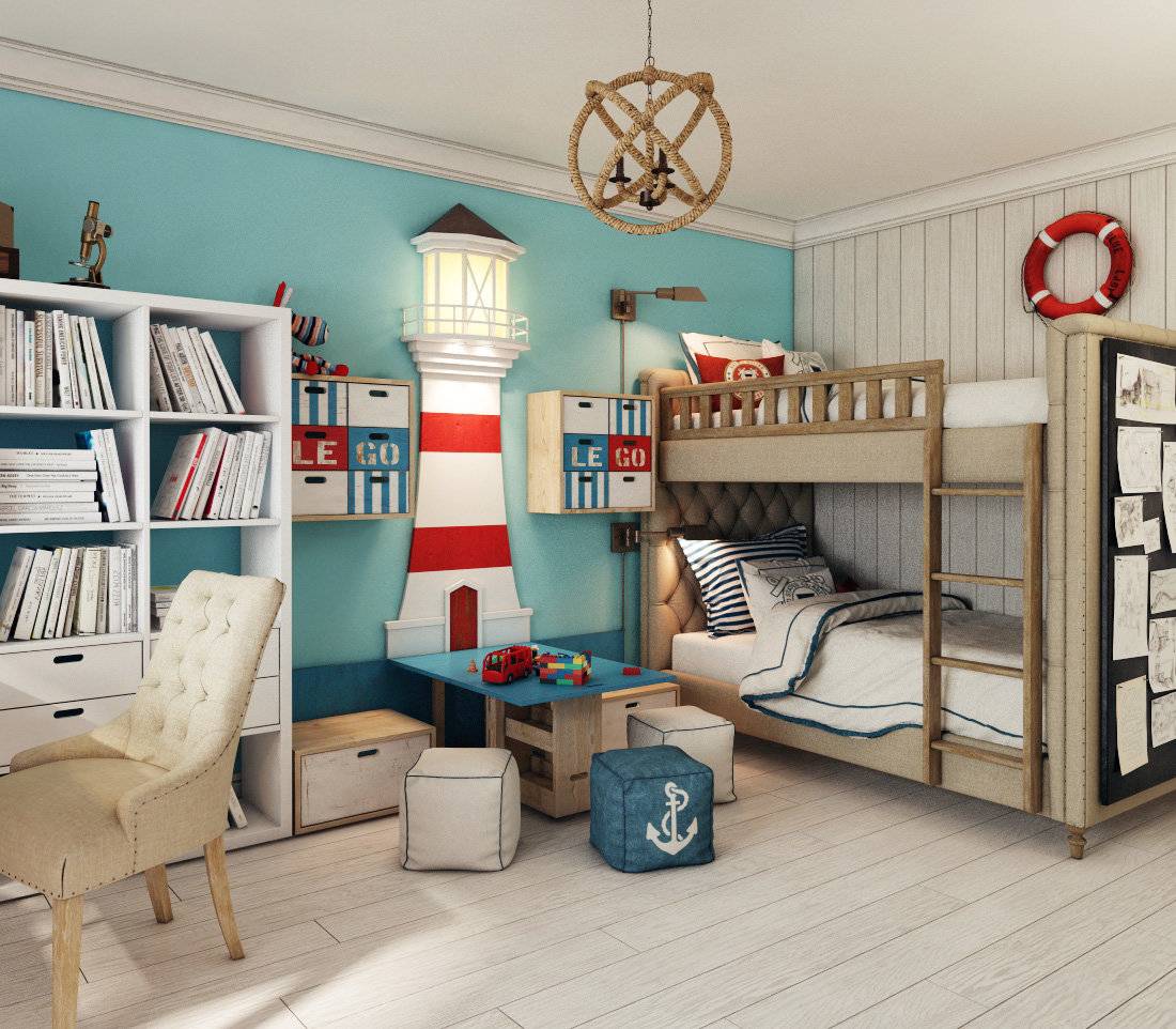 Морская тематика очень часто используется при оформлении детской комнаты. Детали такого интерьера оказывают положительное воздействие на психоэмоциональное развитие ребенка, стимулируют его фантазию. Кстати, именно в этот дизайн как нельзя лучше вписывается двухъярусная кровать, которую в других интерьерах обыграть не так-то просто. Для мальчиков предпочтительно цветовое решение из белого и тёмно-синего. Юному моряку наверняка придутся по душе развешанные по стенам сети, якорь, весла, а также спасательные круги и другие атрибуты. А если поставить в комнате декор в виде фрагментов корабля, это помещение наверняка станет любимой зоной пребывания малыша.