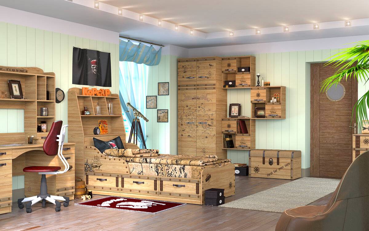 Морской стиль чаще можно встретить в детской комнате у мальчика, который декорируют в «пиратском стиле». Дети любят все необычное, и такой интерьер сможет стать не только отличной альтернативой скучному шаблонному решению, но также многие элементы декора будут крайне полезны для маленького мужчины. Аквариумные рыбки поспособствуют в развитие чувства ответственности, бинокль или подзорная труба пригодятся для познания окружающего мира, глобус и карты дальних стран – для развития географических знаний.