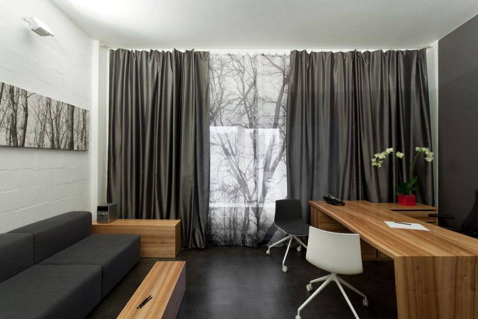 Сосредоточение – вот, что требуется человеку за работой. И присутствие серого цвета в интерьере этой комнаты как нельзя лучше будет способствовать умственной деятельности. Деловая, и даже немного офисная, атмосфера настроит вас на нужный лад. А минималистический стиль исключит вероятность отвлечься на посторонние предметы.