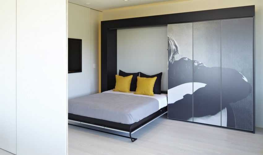 Своеобразно устроен шкаф-кровать. Внешне нижняя сторона спального места, к которой крепится толстый матрас, выглядит как широкая дверка большого шкафа. Только она не отрывается влево или вправо, а откидывается в сторону „на себя“; ее нижняя часть укреплена на шарнирах.