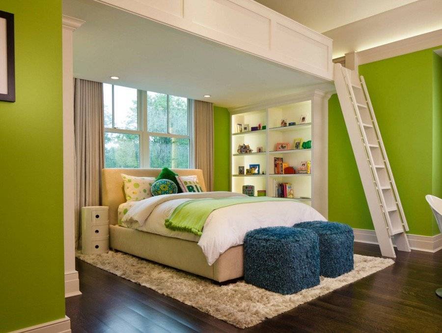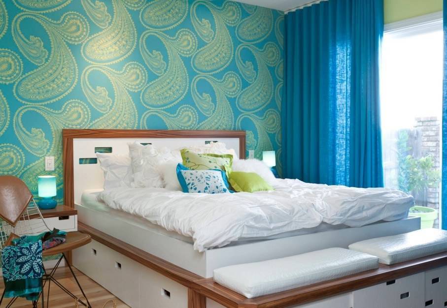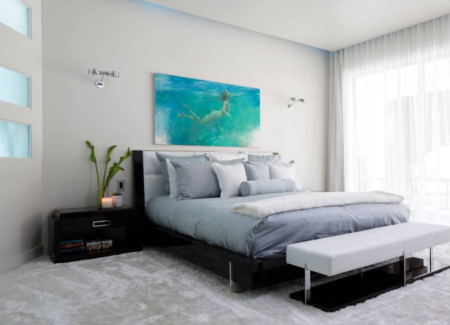 Из более ярких оттенков современный интерьер спальни хорошо смотрится со спокойными зелеными, умиротворяющими синими, элегантно серыми тонами.