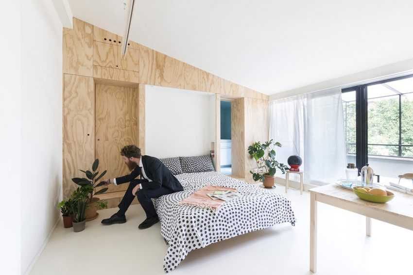 На узких полках позади „дверцы“ находится постельное белье. Утром после сна принадлежности убираются на полки, матрас с подставкой поднимаются и прячутся в шкафу, так что ничто о кровати не напоминает.