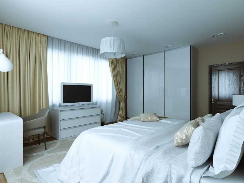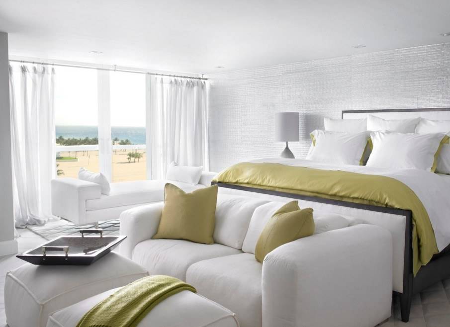Универсальный белый цвет остается самым привычным оформлением спального помещения. Для тех, кто боится, что белый оттенок будет напоминать о стерильности больничных комнат, можно использовать 50 оттенков этого цвета. Теплые тона помогут сделать помещение более приятным для отдыха, холодные оттенки создадут настроение элегантности и стильности.