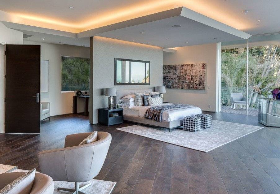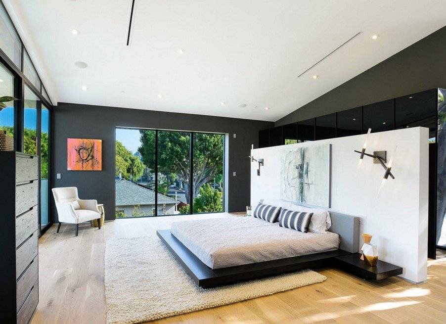 В просторной спальне современный стиль разворачивается во всей красе, ведь тут есть место и для дизайнерского ковра, и для необычных светильников, и для высокого стеллажа. Хорошо смотрится подвесной туалетный столик с большим зеркалом с подсветкой по периметру. А для декора возьми серию из нескольких панно или собери коллаж из любимых фотографий.