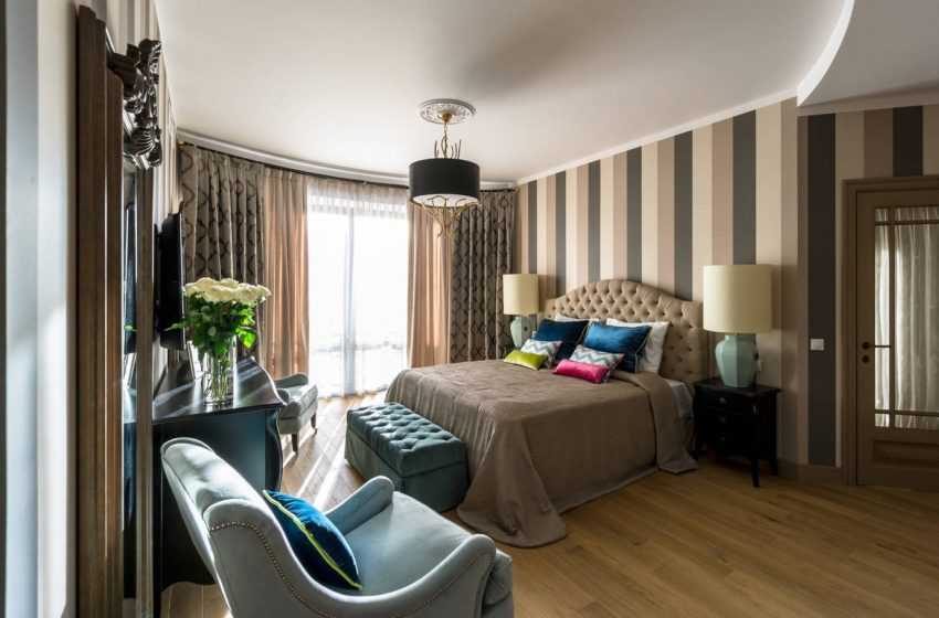 Первым делом, у центральной стены располагают двухспальною кровать или мягкий диван. Подбор мебельной атрибутики, должен осуществляться в соответствии выбранного стиля. Например, для классической спальни понадобится большое спальное место с обилием роскошных элементов.