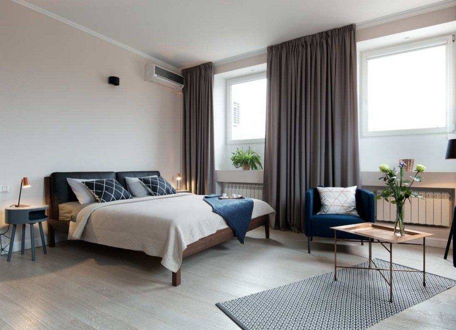 Однако, если спальня маленькая, длинные шторы могут еще больше уменьшить и перегрузить ее. В такой ситуации лучше выбрать, например, одну занавеску и изящно закрепить ее сбоку от окна.
