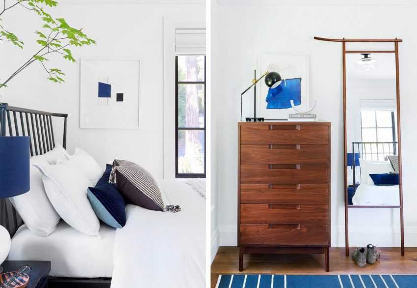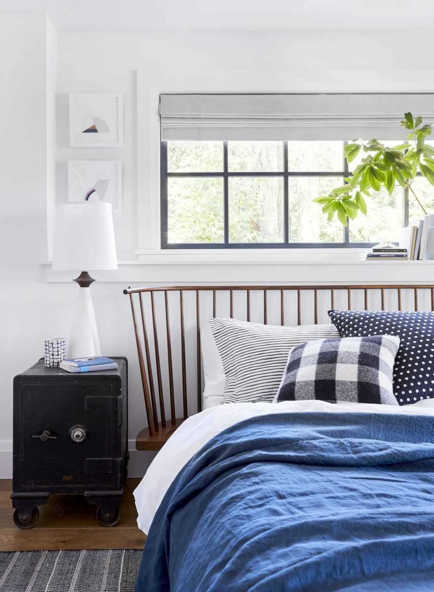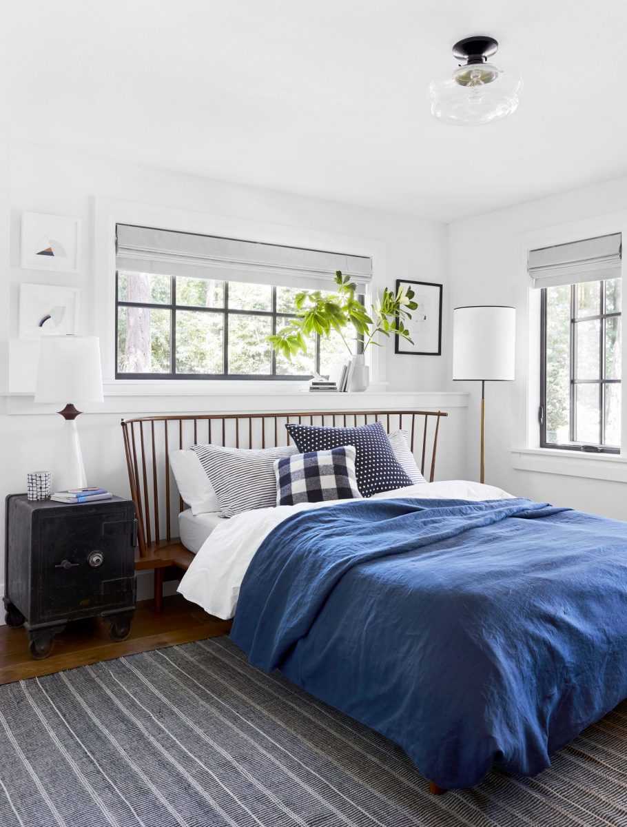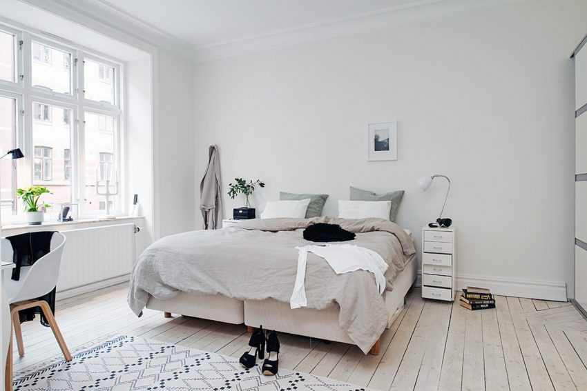 Спальня в скандинавском стиле в загородном доме предполагает большое количество натуральных предметов. Желательно не приобретать пластиковые панели, а покрасить спальню своими руками или поклеить обои. Также не следует натягивать потолок, лучше пригласить мастеров для покраски естественным способом. Можно побелить потолок или покрасить обыкновенной краской.