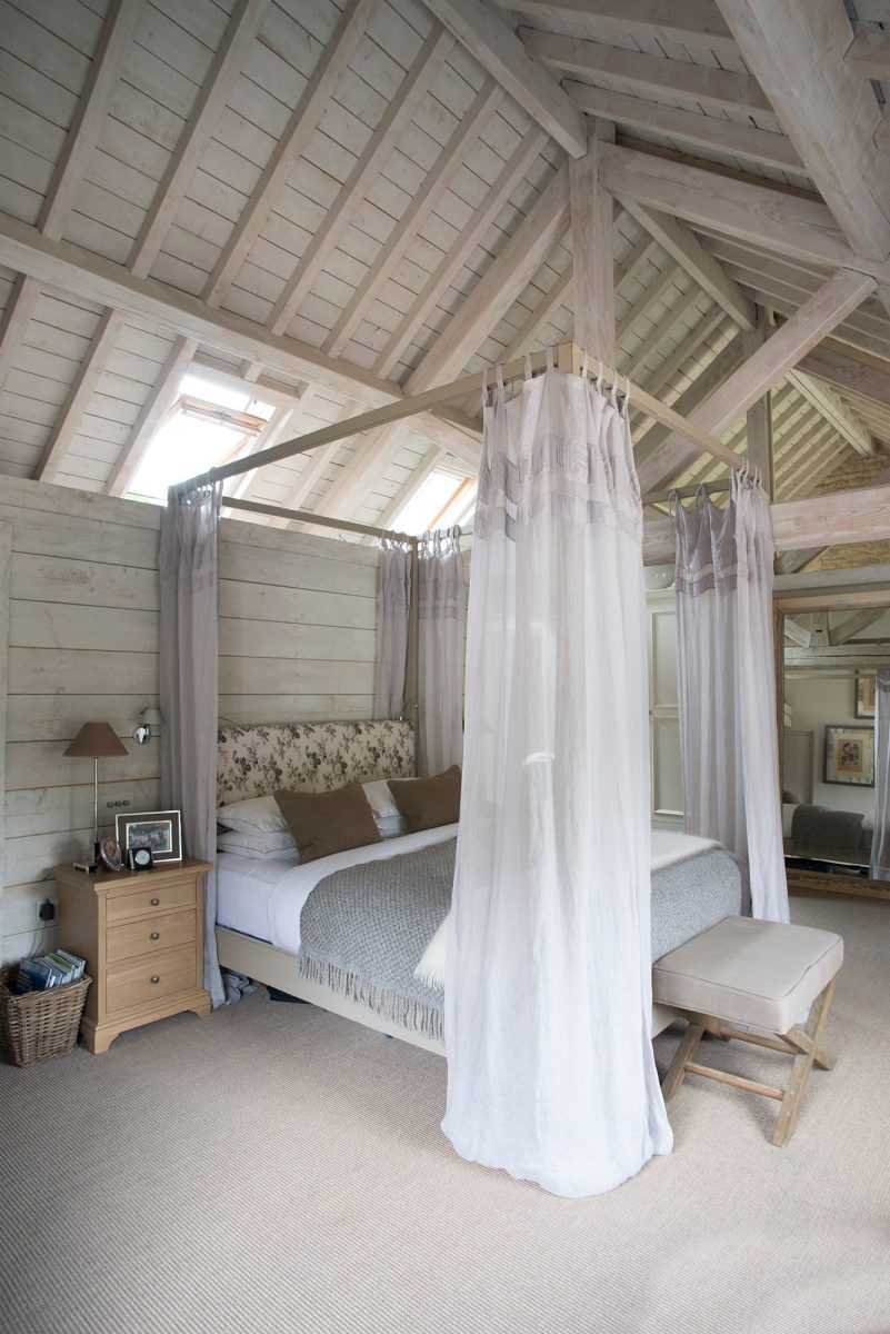 Спальное место для двоих можно оборудовать и в чердачной зоне. За счет этого вы сможете рационально задействовать всю площадь загородного коттеджа и красиво оформить зону отдыха на мансарде. Оборудование мест для отдыха в местах максимального скоса потолочной поверхности – разумная идея для спальни с кантри-дизайном.