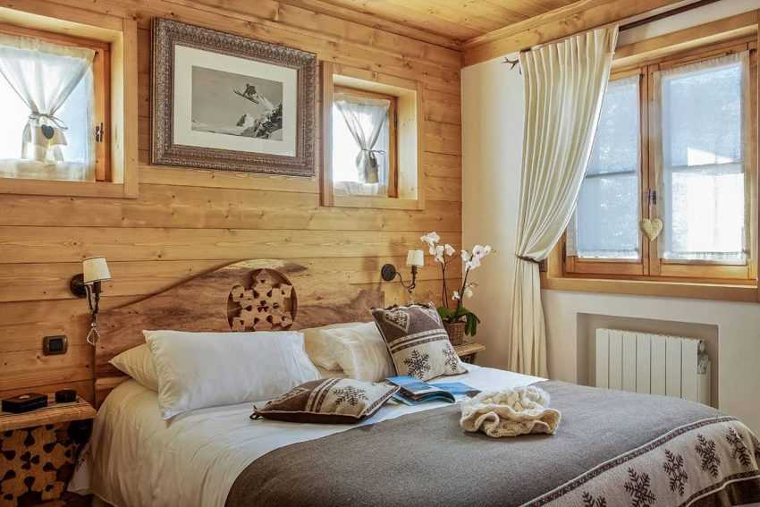 Здесь уместны шторы и постельные принадлежности из грубого льна и мешковины. Органично будут выглядеть накидки и прикроватные коврики из овчины.