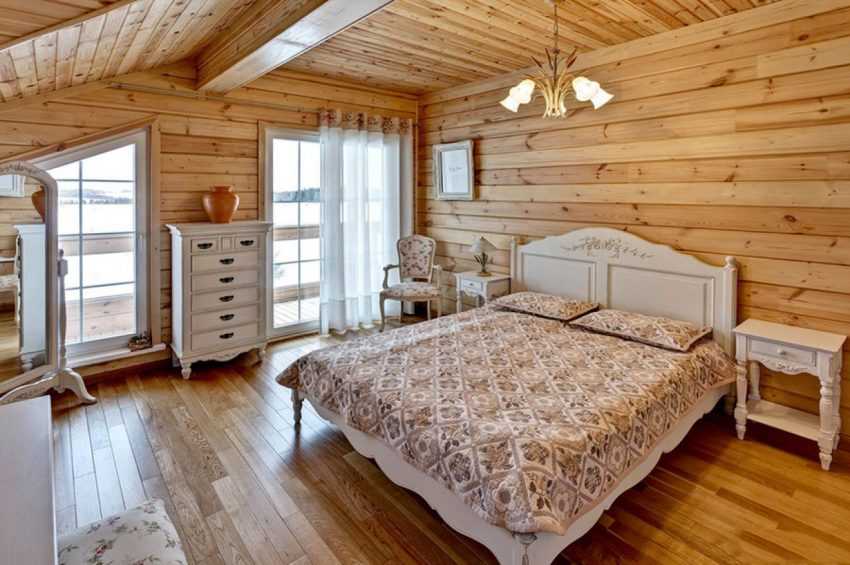 Предпочтение следует отдавать мебели из натуральных материалов. Большая просторная кровать из массива дерева в деревянном доме — идеальный вариант.