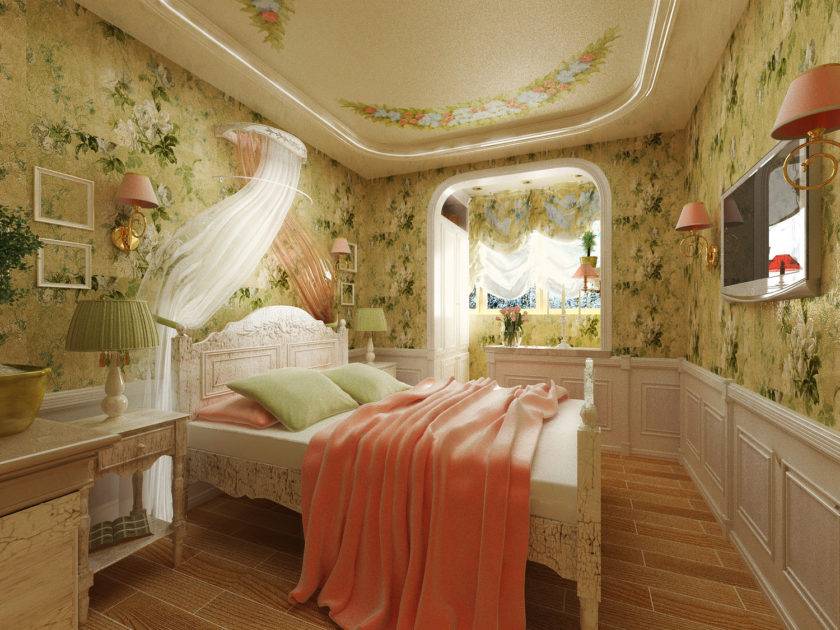 Кантри во французском стиле – это преобладание светлых тонов, изящные формы мебели. Прованс создает в спальне воздушную, невесомую атмосферу.
